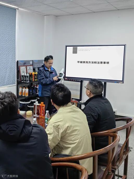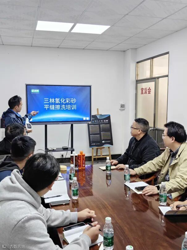 培训开场,资深工程师深入讲解氢化彩砂特性。在平缝工艺讲解中施工步骤以及工具的选择。对于擦洗环节,着重说明时间节点、方法和注意事项,以及三林彩砂专用擦洗液的使用方法。通过案例演示,让团队明白擦洗过早或过晚都会影响效果,为实践操作筑牢基础。