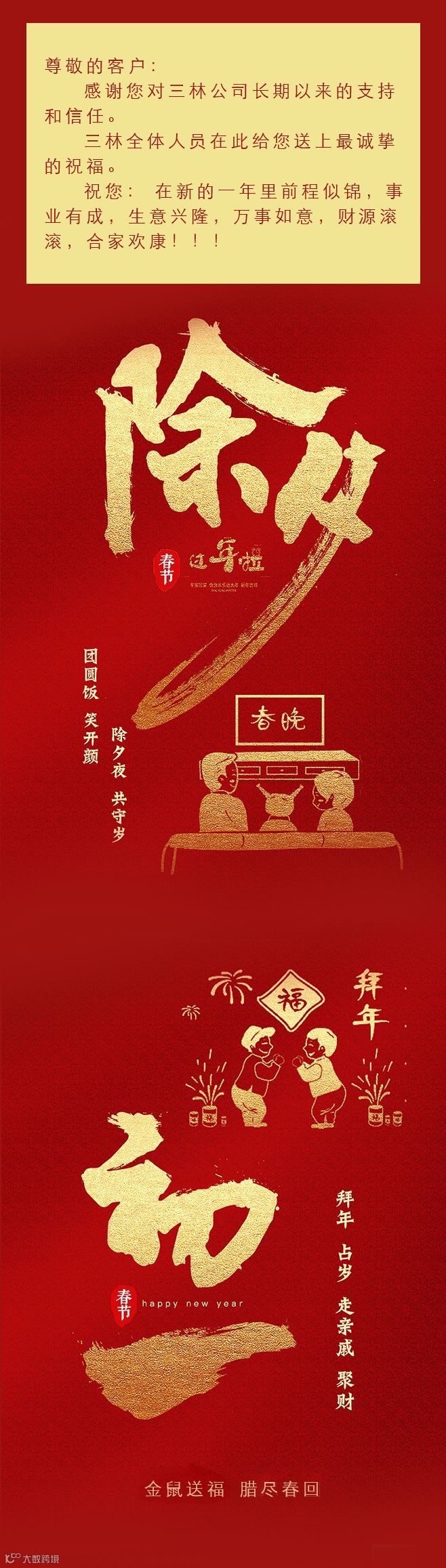 导读:尊敬的客户: 感谢您对三林公司长期以来的支持和信任。 三林全体人员在此给您送上最诚挚的祝福。 祝您: 在新的一年里前程似锦,事业有成,生意兴隆,万事如意,财源滚滚,合家欢康!!