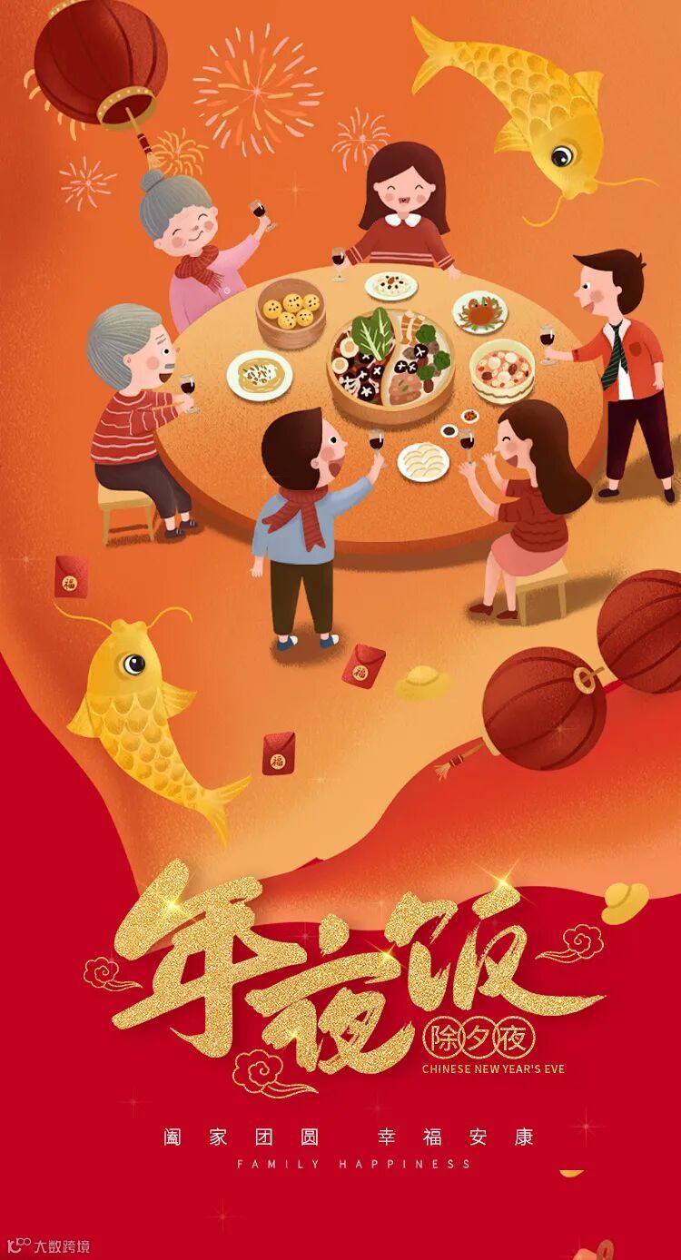 除夕夜,庆团圆,送你一桌团圆饭。吉祥的配菜,幸运的主菜,健康的玉米粥,平安的如意果,一桌的财运、福运和好运,三林建材在此祝你新年快乐,万事如意!