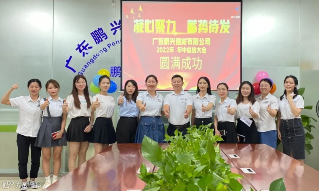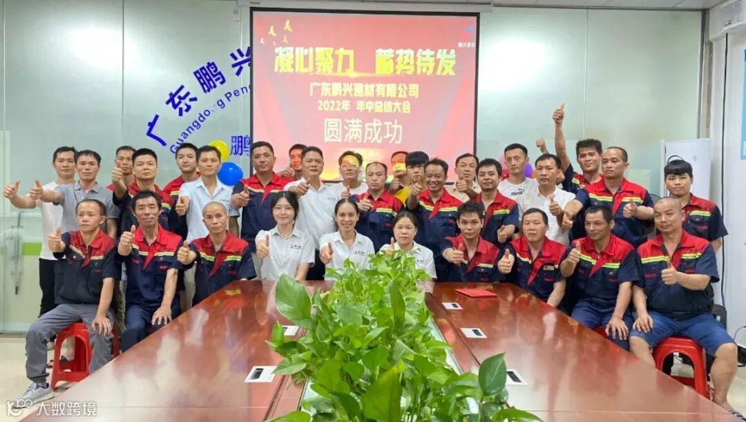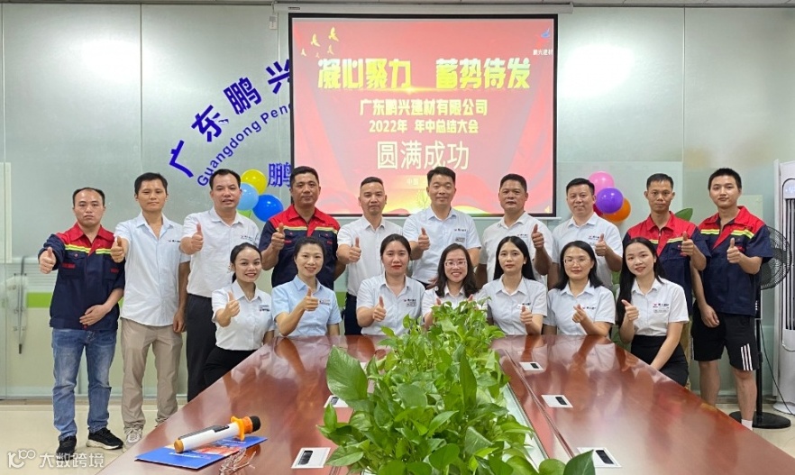 同力协契,踔厉奋发;凝心聚力谋发展,踔厉奋发新征程,7月30日,广东鹏兴建材有限公司,在佛山总部召开年中总结大会,此次会议除了总部全体人员参与,还有远道回来的:云南鹏友分公司代表、福建鹏友分公司代表、湖南鹏兴分公司代表!