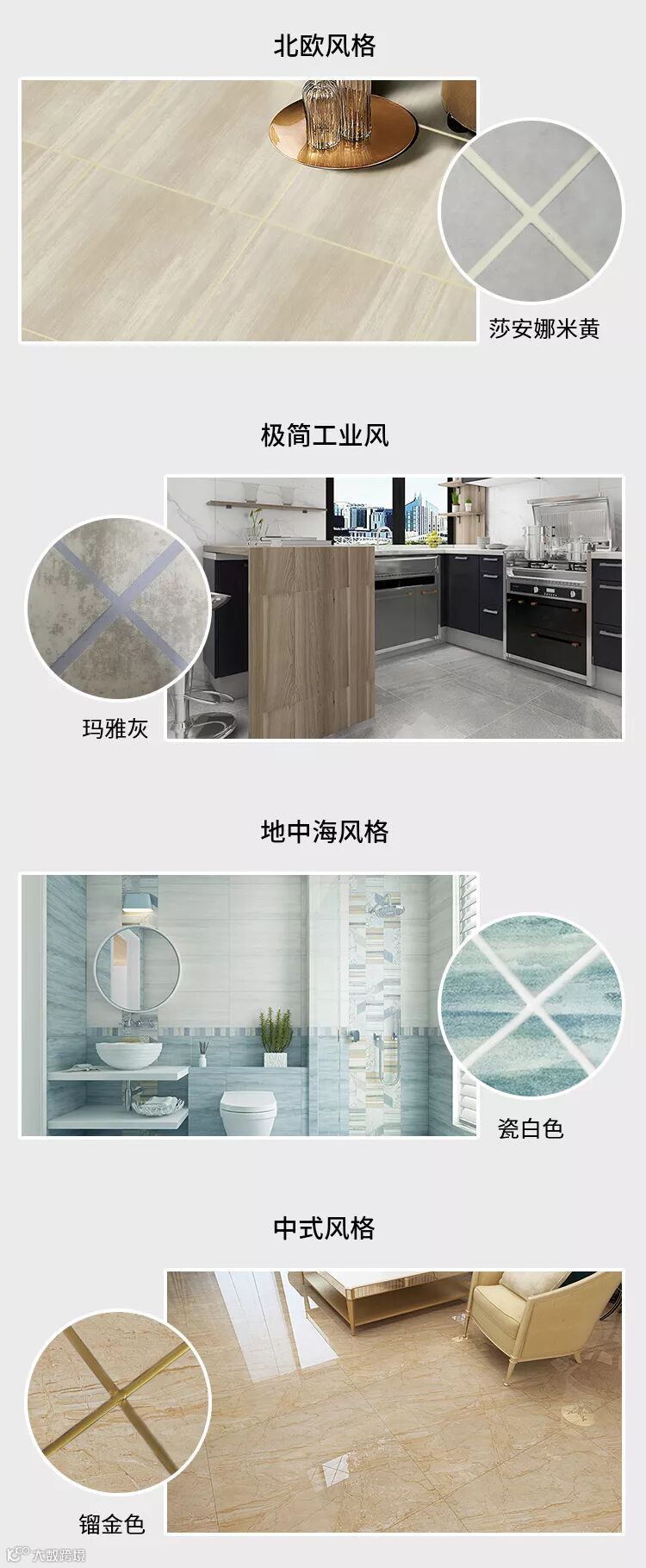 美缝剂色彩丰富,可以有哑光、亮光、闪亮等效果,不同的颜色搭配不同材质的瓷砖,风格多样,如新中式、简约式、北欧式等,可以完美搭配瓷砖,浑然一体,看起来时尚大方,令人眼前一亮。