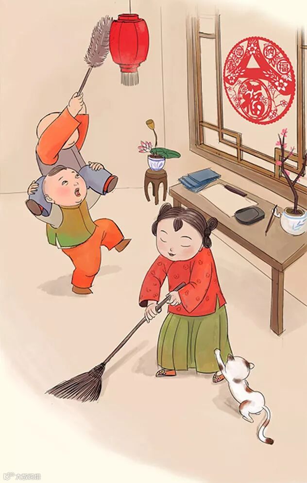 (2) 到了腊月,家家户户都准备过年了。在北京,通常把腊月二十四日定为"扫房日"。扫尘主要是将家里进行彻底清洁,主妇通常先将房里的床铺家具遮罩起来,用头巾将头包好扫尘,然后用扫帚将墙壁上下扫干净。扫屋之后,擦洗桌椅,冲洗地面。扫房之后,各店铺、居民家焕然一新。新贴的春联,鲜艳夺目,显示着红红火火的鸿福盛景。活灵活现的门神,抬头见喜的横幅,精美的窗花,五彩的年画,花团锦簇的灯笼,和神龛上丰饶的祭品,无不显示着喜气洋洋、欣欣向荣的节日景象。