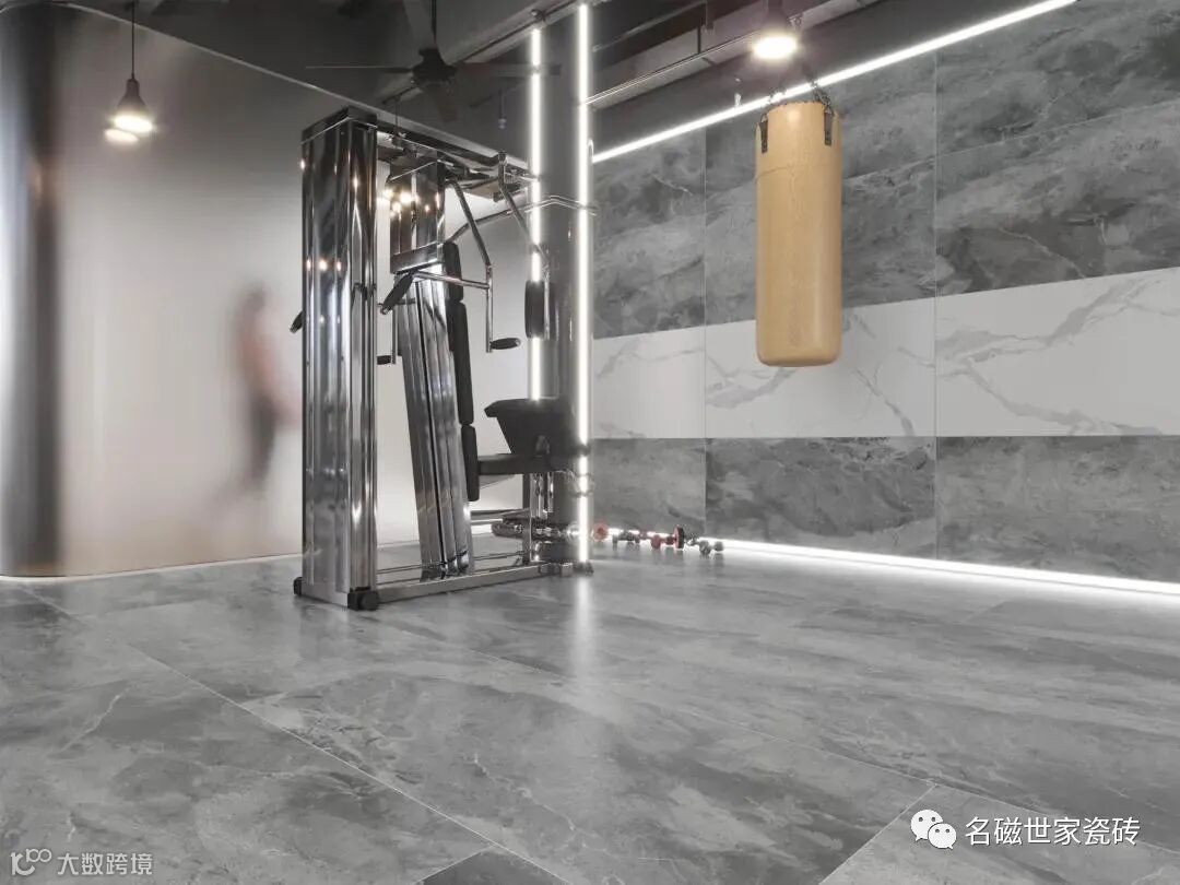 格调优雅的灰色加上白色纹理,纹理自然流畅,变幻流动中传承着大自然神奇的造化,彰显出顶级石材的绝代风采,让健身房具有一种简洁优雅的美感。