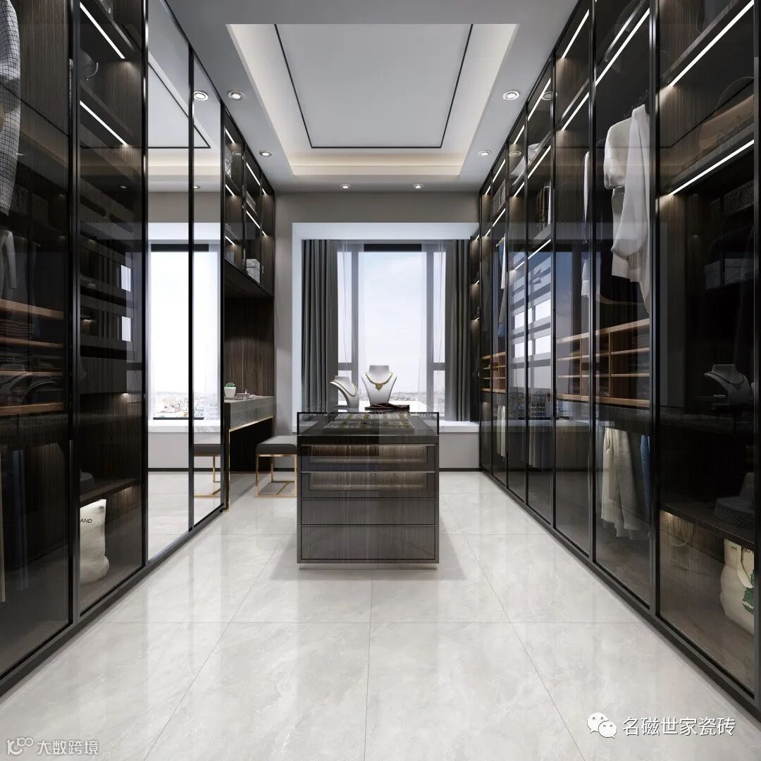设计师打破常规与传统的铺贴方式,根据产品的色泽与纹理,铺就出令人赏心悦目的衣帽间,每一处的装饰都与瓷砖完美相衬,展现出和谐之美。