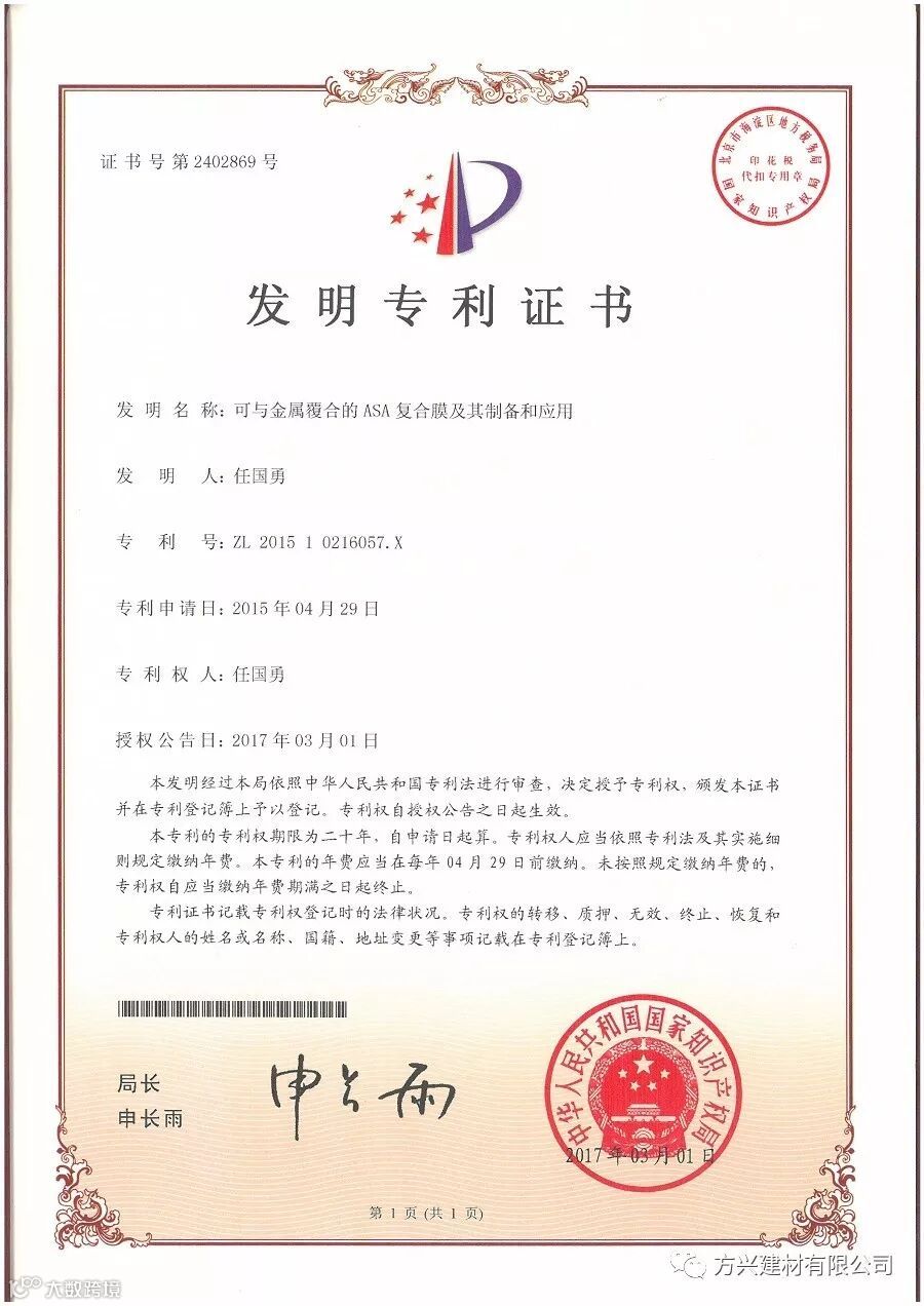 方兴公司采用的是高温熔融(化学结合为主)的覆膜工艺。在1955年,日本发明了树脂膜与金属板的热融覆合工艺;1977年,热融工艺率先在食品行业大规模应用,食品包装盒、饮料罐等;目前,世界上用热融工艺生产户外覆膜板的企业很少。热融工艺使用的热融性粘合树脂是一种热塑性材料,分子量较高,长期结合力强并且稳定。热融粘合材料具有非常好的延展性,延展率500~700%,对不同材料适应性强,特别适合温差大的地区。由于热融材料的分子量高,材质致密均匀,长期使用不会产生气泡、脱层现象且环保、无毒无味。这种技术是将树脂膜与金属板之间通过高温、热熔、压合在一起,形成分子之间物理与化学相融。技术关键在于对膜的改性处理,将ASA膜改性处理成热熔膜。方兴公司攻克了这个技术难关,获得发明专利。