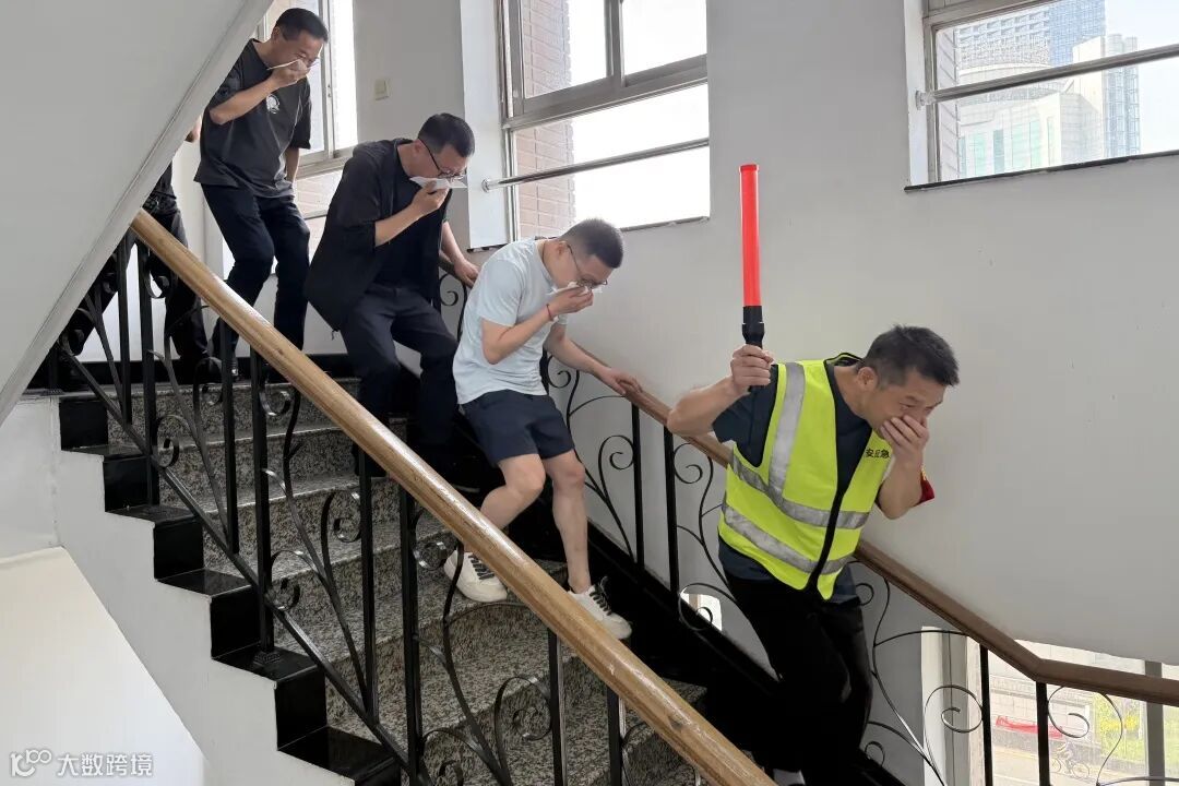 应急疏散演练环节,各区域安全员在火警警报拉响后迅速到位。在他们的有序引导下,全体人员弯腰捂鼻沿楼层逃生方向迅速撤离。整个演练过程秩序井然、响应迅速。