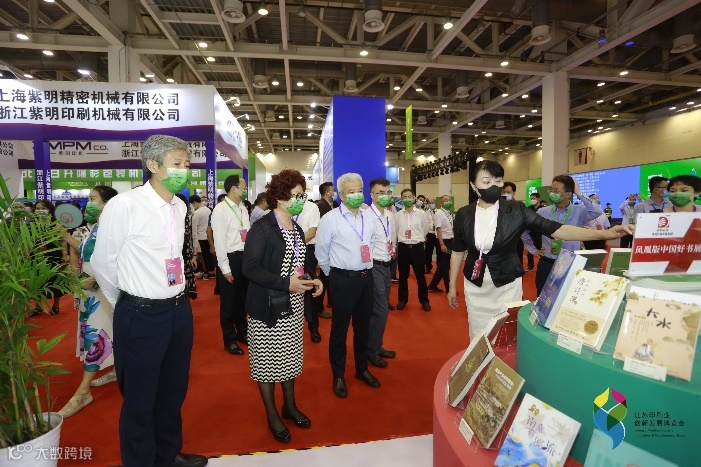中国印刷技术协会名誉理事长王岩镔,江苏省委宣传部常务副部长、省新闻出版局(省版权局)局长梁勇,中国新闻出版传媒集团董事长马国仓,中宣部出版产品质检中心副主任仇英义,凤凰出版传媒集团党委书记、董事长孙真福,江苏省印刷行业协会会长钱薇,苏州市委副秘书长冯春林莅临文贸集团展位,凤凰文贸党委书记、总经理俞慧洵进行介绍。