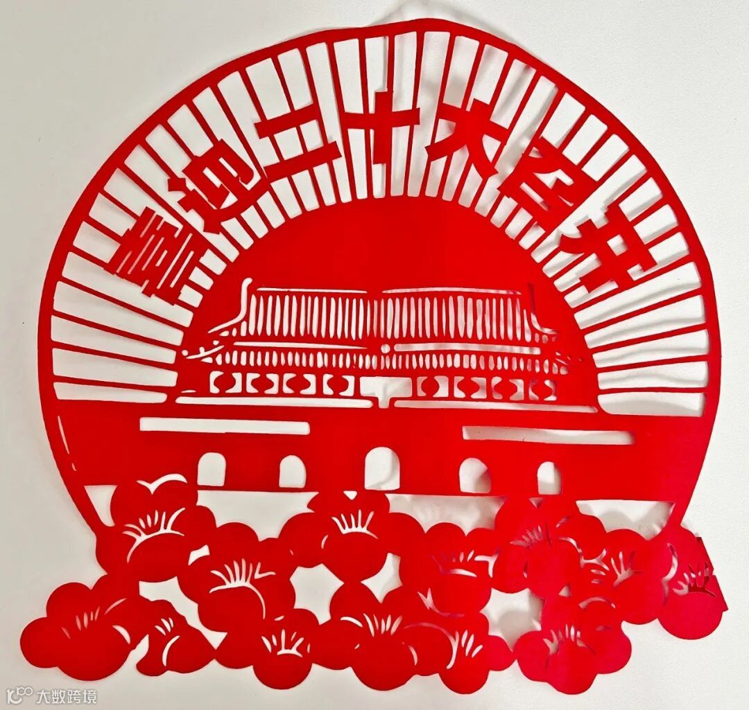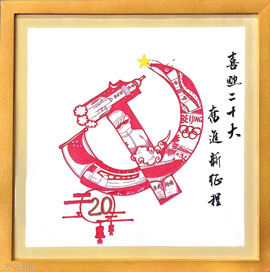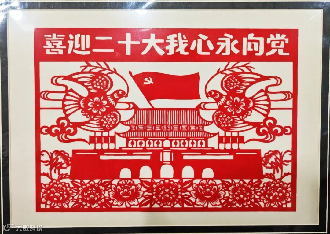 为了迎接党的二十大胜利召开,我选择了以剪纸这一传统文化表现形式表达对党、对祖国、对人民的热爱之情。这幅剪纸作品以北京天安门为主题,鲜红的党旗在北京天安门上高高飘扬。喜鹊、祥云、灯笼、牡丹花等传统吉祥纹样,环绕四周、花团锦簇、喜鹊登枝,生动形象的将全国人民喜迎二十大的热闹图景都集中呈现在了这幅作品中。
