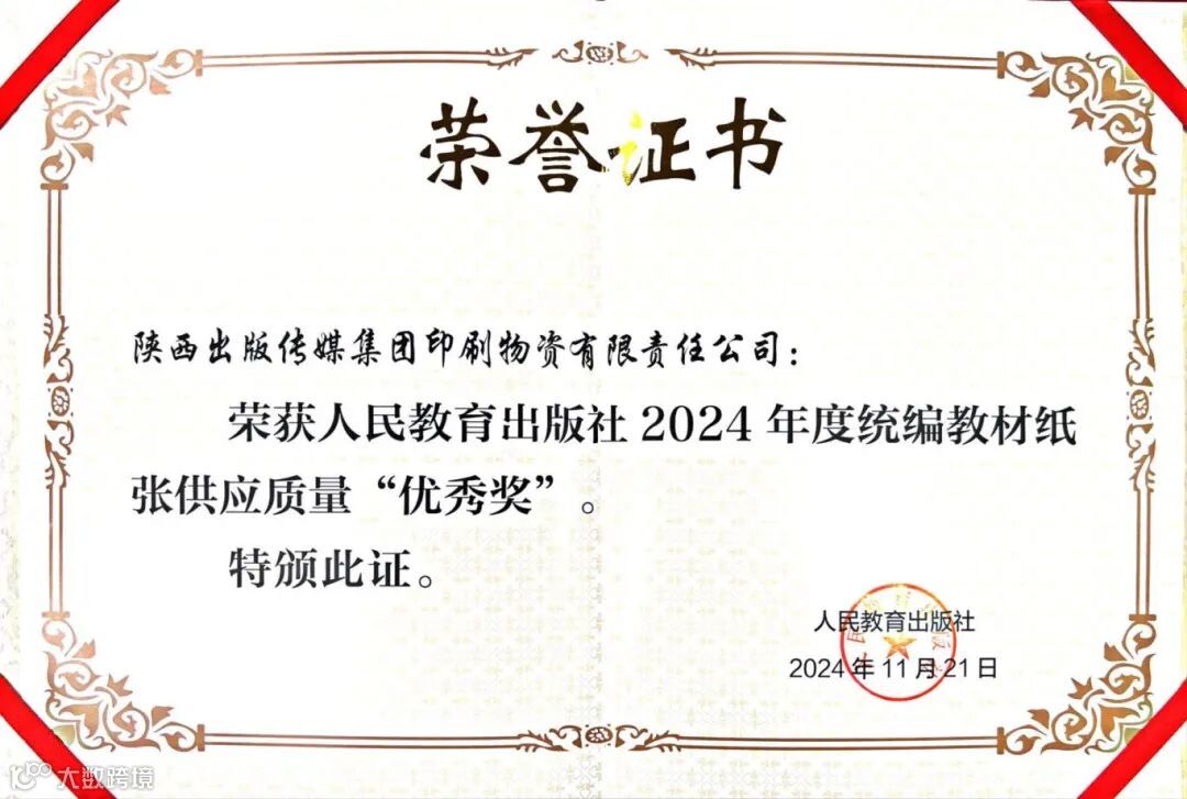 会上,人民教育出版社对公司的年度工作给予了高度肯定,并向公司颁发2024年度统编教材纸张供应质量“优秀奖”荣誉。