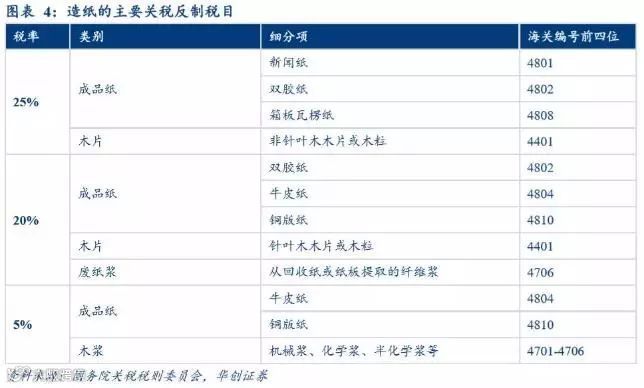 (4)成品纸:各纸种均被纳入征税范围,新闻纸和双胶纸影响较小,铜版纸、箱板纸、瓦楞纸美国为主要进口地之一,进口成品纸成本抬升。主要的征税对象情况为:
