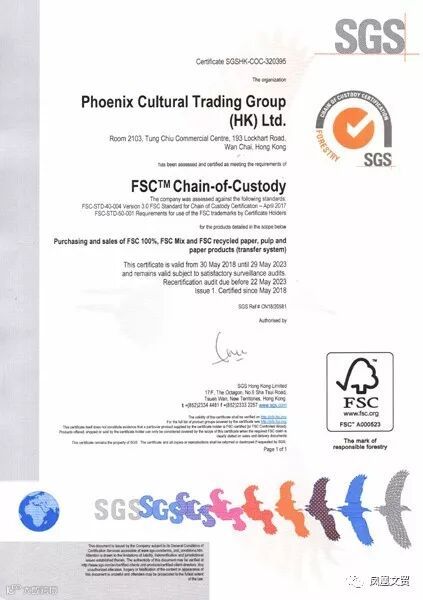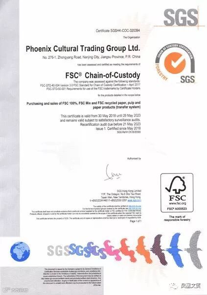 近日,SGS为凤凰文化贸易集团有限公司颁发FSC® COC(森林管理委员会 产销监管链)认证证书。