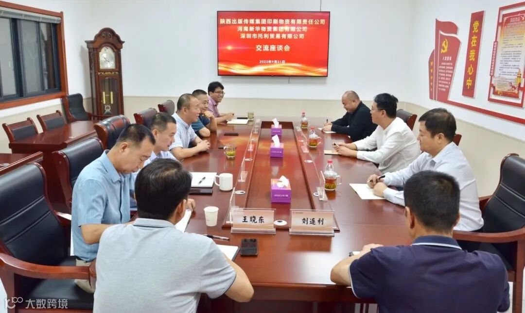 9月21日下午,河南新华物资集团有限公司党委书记、执行董事叶汉青,深圳市托利贸易有限公司总经理高树生、出版部主任杜庆华一行到陕西出版传媒印刷物资公司座谈交流。印刷物资公司党总支书记、总经理李国强,党总支副书记、副总经理同天义,党总支委员、副总经理郭瑞,党总支委员、副总经理、工会主席慕华军及公司相关部门负责人参加座谈会。