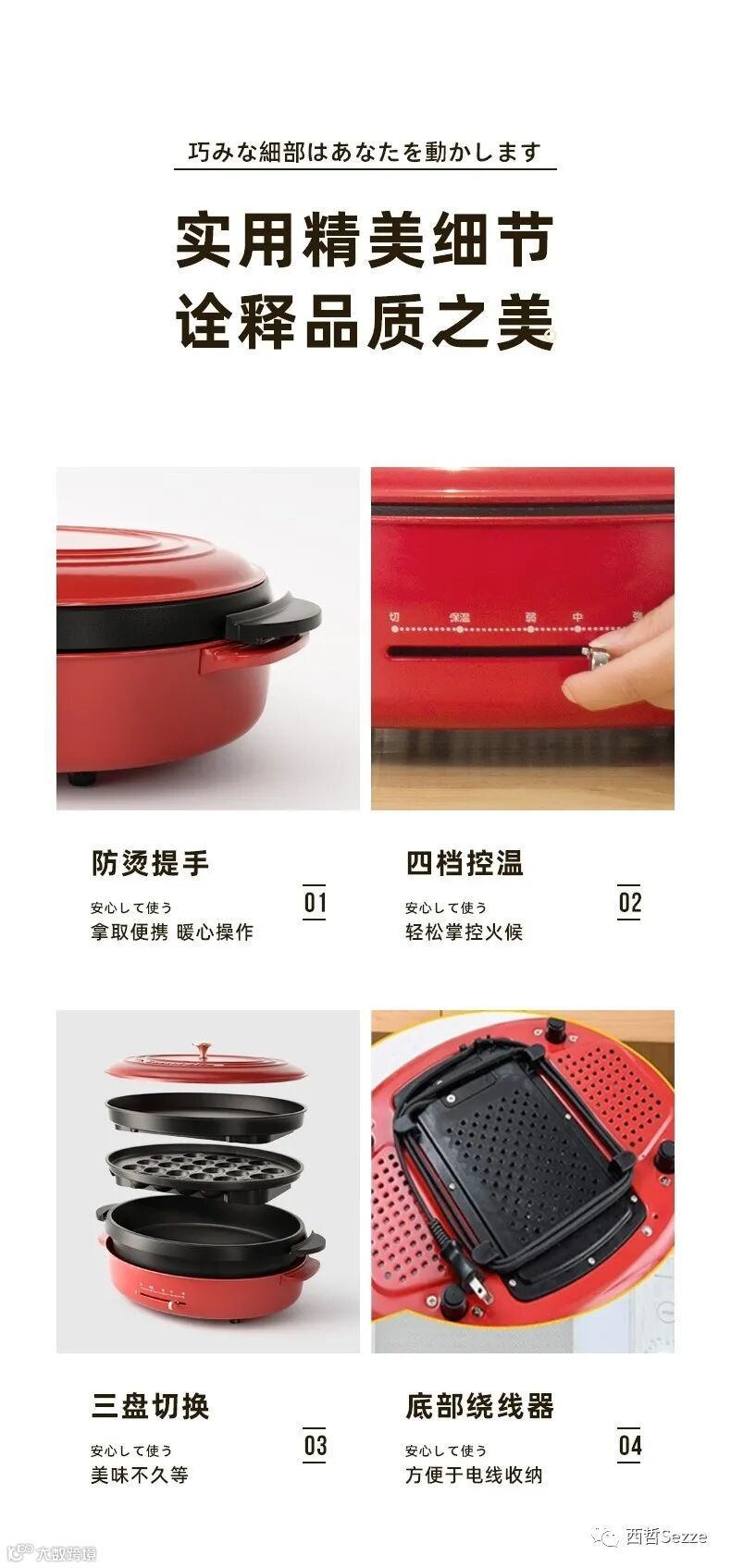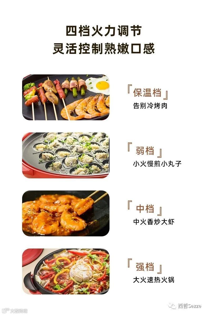 烤盘的整体细节都很完美,符合人体工学的耐高温提手让搬动很舒适;却增加了牢固度,四挡控温让烧烤小白彻底掌握火候;使用寿命更长;漂亮并且便于收纳的面板,每一处细节都彰显了西哲技术团队的匠心独运。