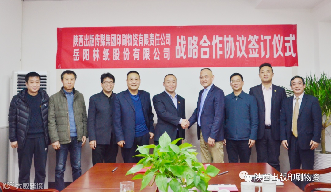 2021年2月1日下午,陕西出版传媒集团印刷物资有限责任公司与岳阳林纸股份有限公司达成并签署年度纸张销售战略合作协议。印刷物资公司党总支书记、总经理李国强,党总支副书记、副总经理同天义,党总支委员、副总经理慕华军,党总支委员、出版纸张公司经理李西勇,社会纸张公司经理刘连利出席会议。岳阳林纸股份有限公司岳阳分公司总经理赵庆义,岳阳分公司副总经理、岳阳林纸销售公司总经理朱志辉,岳阳林纸销售公司西北分公司总监侯万鹏,岳阳林纸销售公司西北分公司陕甘办事处高级经理章志勇,岳阳林纸销售公司西北分公司陕甘办事处李凯代表岳阳林纸出席签约仪式。