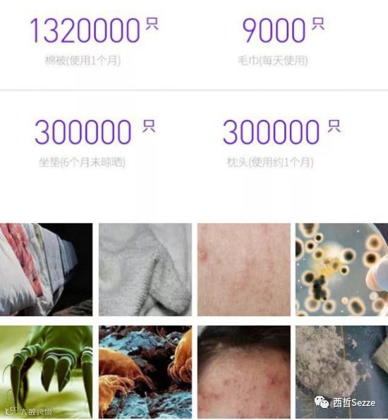 一个月不洗的棉被有1320000只螨虫,每天在使用的毛巾有9000只螨虫,一个月未洗的坐垫有30000只螨虫,一个月未洗的枕头有300000只螨虫;