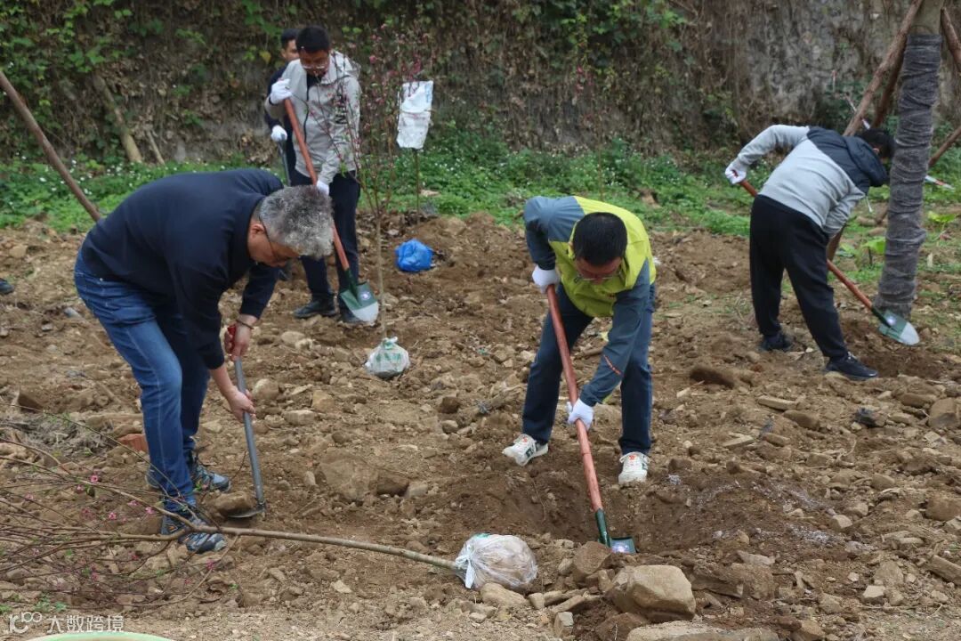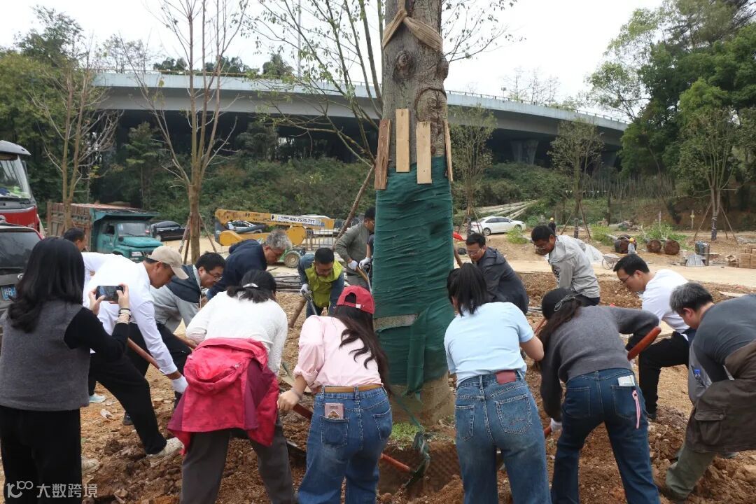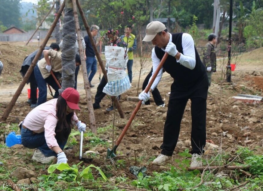 植树现场,大家分工协作、默契配合。挥锹铲土、扶苗压实、浇水定根,同时将写有初心寄语的“认领牌”悬挂在树苗上。