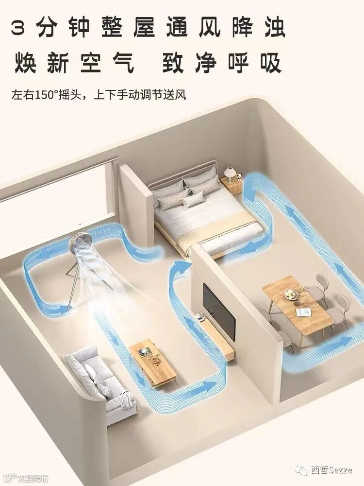西哲的空气循环扇,它通过有效带动周围环境的自然风流动,形成空气对流循环,从而减少空间内热量的积累,达到降温清凉的效果。