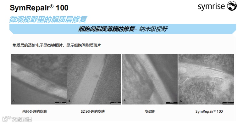 此次研究亮点在于透射电镜纳米级可视化验证。屏障经丙酮破坏后,涂抹SymRepair®100的皮肤脂质薄膜已恢复至正常形态,而对照组TriCeram未能完全修复▼