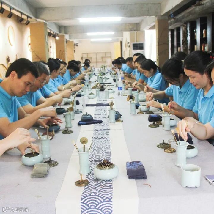 香艺师带着广州丽新的员工们一起打篆香,压香灰、放香篆、填香粉、起篆、点香、品香。在一呼一吸之间,感觉心跳的平缓身体的安宁,缓慢的呼吸,寻找呼吸的顺畅,静观身体的感受,冥想中员工们的心灵得到了释放,很好的疏导了员工们的压力与情绪。