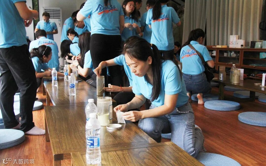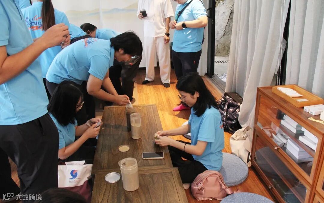 广州丽新的员工们来到制香的房间,在芳香师的引导下,辨识各香材功效特性,了解传统和制香方法,开始用七溪地的非遗香粉,石营蒲、广董香、郁金香、降真香等等,亲手调香,配置专属的香粉,制作自己的专属香囊。