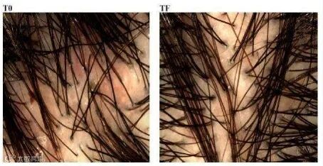 试验中的一名受试者在T0和Tf治疗后的头皮三维扫描图像,达到全面健康的状态。
