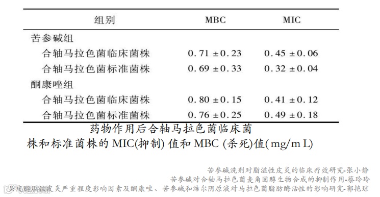 苦参碱对合轴马拉色菌的MIC值<酮康唑,控油止痒效果优于酮康唑洗剂。