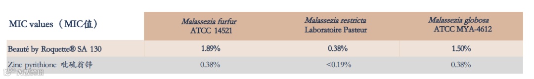 Beauté by Roquette®SA 130在pH=5时 ,是一种头皮屑马拉色菌生长抑制剂。