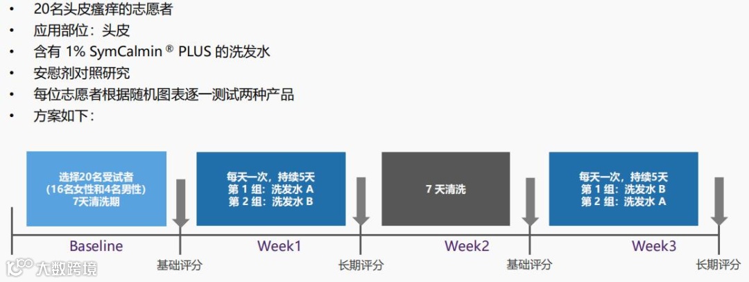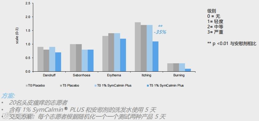 人体临床验证(20名头皮瘙痒受试者,交叉对照设计):含1% SymCalmin® PLUS洗发水使用5天后,头皮瘙痒感降低35%,同时改善头屑、脂溢及红斑。