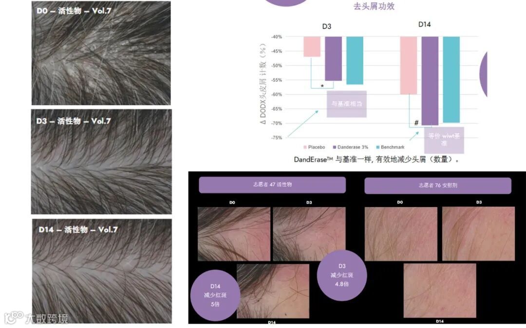 ☑ 临床测试显示,DandEraseTM可媲美市场主流去屑洗发水,所有受试者3天内头屑减少高达95%,甚至含有DandErase的受试者头皮泛红现象也得到大大的缓解。