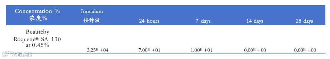 在pH = 5时,Beautéby Roquette®SA 130对马拉色菌(ATCC 14521)生长的影响。根据NF EN ISO 11930条件进行体外微生物试验。在不同的孵育时间测量生长,并以菌落形成单位/ml表示。
