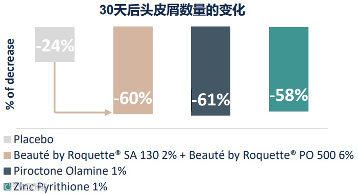 2% Beauté by Roquette® SA 130 + 6% Beauté by Roquette® PO 500的组合在减少头皮屑数量方面与吡硫翁锌和OCT一样有效。