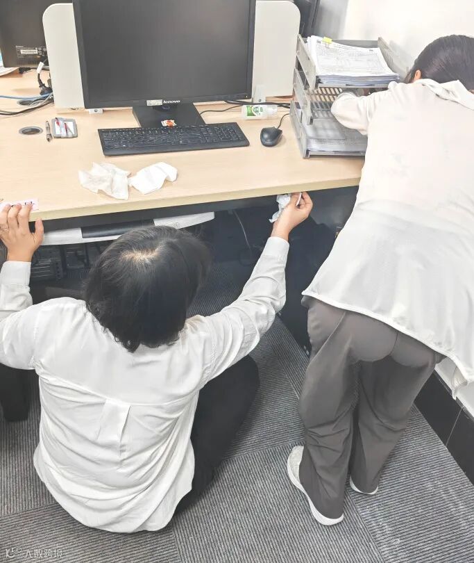 “比赛开始”!在石总的一声令下,女员工们分组开始打扫,将文件、物品归位,清扫垃圾,整理整顿凌乱的桌面,消除电脑电线杂乱的安全隐患。