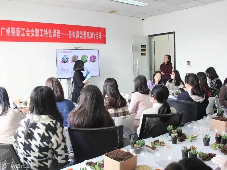 广州丽新工会主席李颖开场后,女职工们开始了多肉微型景观DIY培训活动,跟着老师的指导,认识多肉种类,学习盆栽搭配原则与技巧,亲自体验与拥有属于自己心中的小花园。
