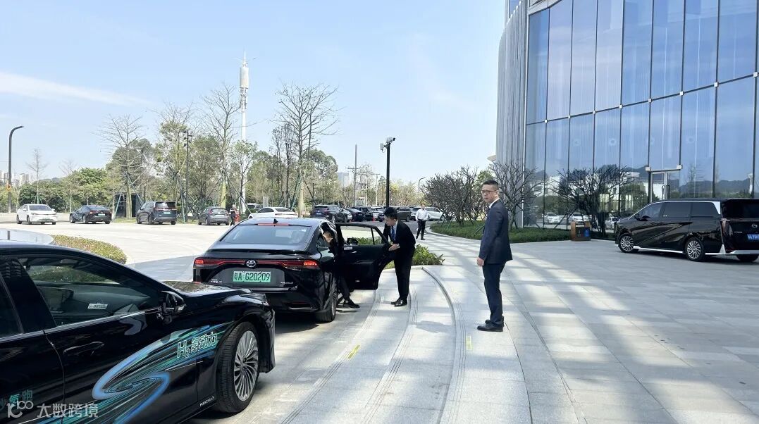 会议当天,12台丰田MIRAI氢能源车辆亮相大会现场,其中2台作为展车供来访领导嘉宾参观,余下10台作为接驳车辆,有序停放于酒店及会场门前。