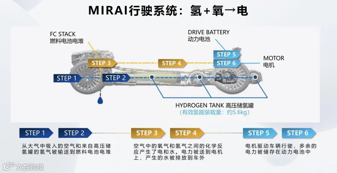 丰田MIRAI是世界首批量产的氢燃料电池车,它搭载让氢气和氧气进行化学反应并产生电能的燃料电池堆,依靠电动机驱动汽车,使用的是清洁能源,“呼吸的是空气,加入的是氢气,排放的只有水”,因此被誉为完全零排放的“终极环保汽车”,未来将对“碳中和”社会的实现具有极大贡献。