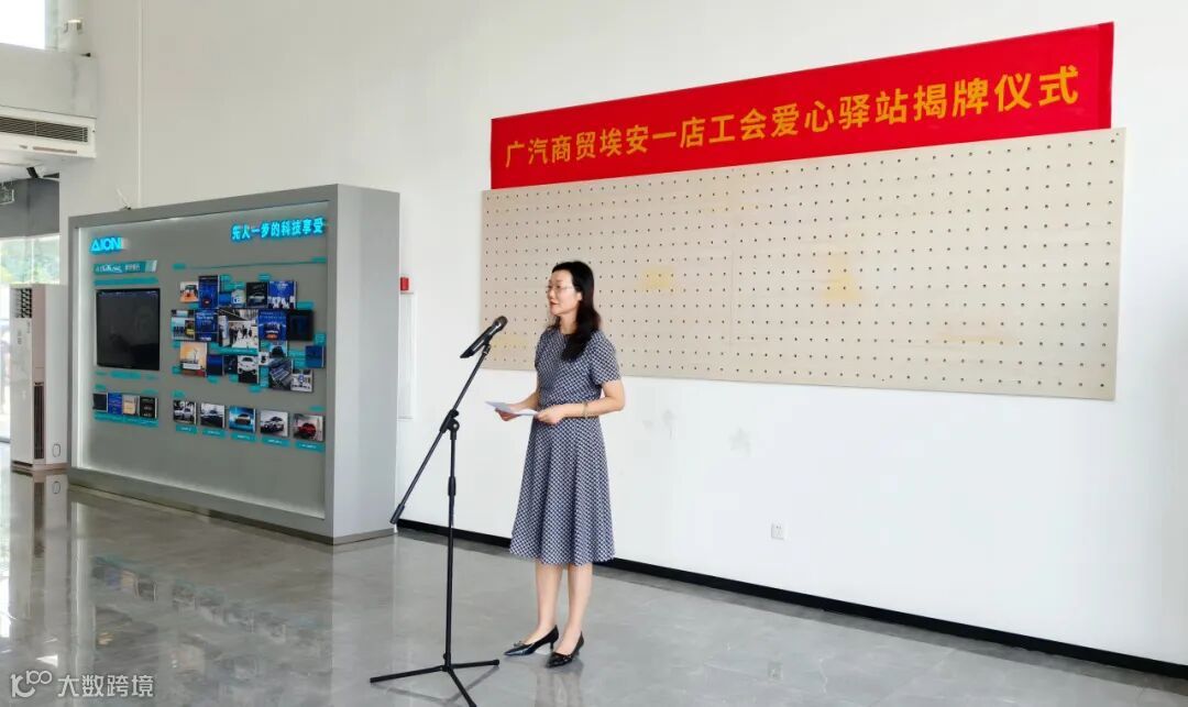 8月27日下午,广汽商贸埃安一店工会爱心驿站正式揭牌。广州市总工会党组成员、副主席申永红,职工服务部部长丁宏武,广汽集团董事、工会主席邓蕾,工会办公室副主任高媛,广汽商贸党委书记、董事长李勇,纪委书记、工会主席潘美婷及广汽商贸本部相关部室、华南区相关企业负责人、驿站工作人员等合计约40人共同出席并见证了驿站揭牌仪式。