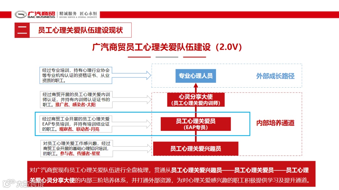 自2023年起,广汽商贸工会持续深化“员工心理关爱兴趣员—员工心理关爱员(EAP专员)—员工心灵分享大使(心理关爱内训师)”三阶培养体系建设,系统化打造企业内部心理关爱骨干队伍。