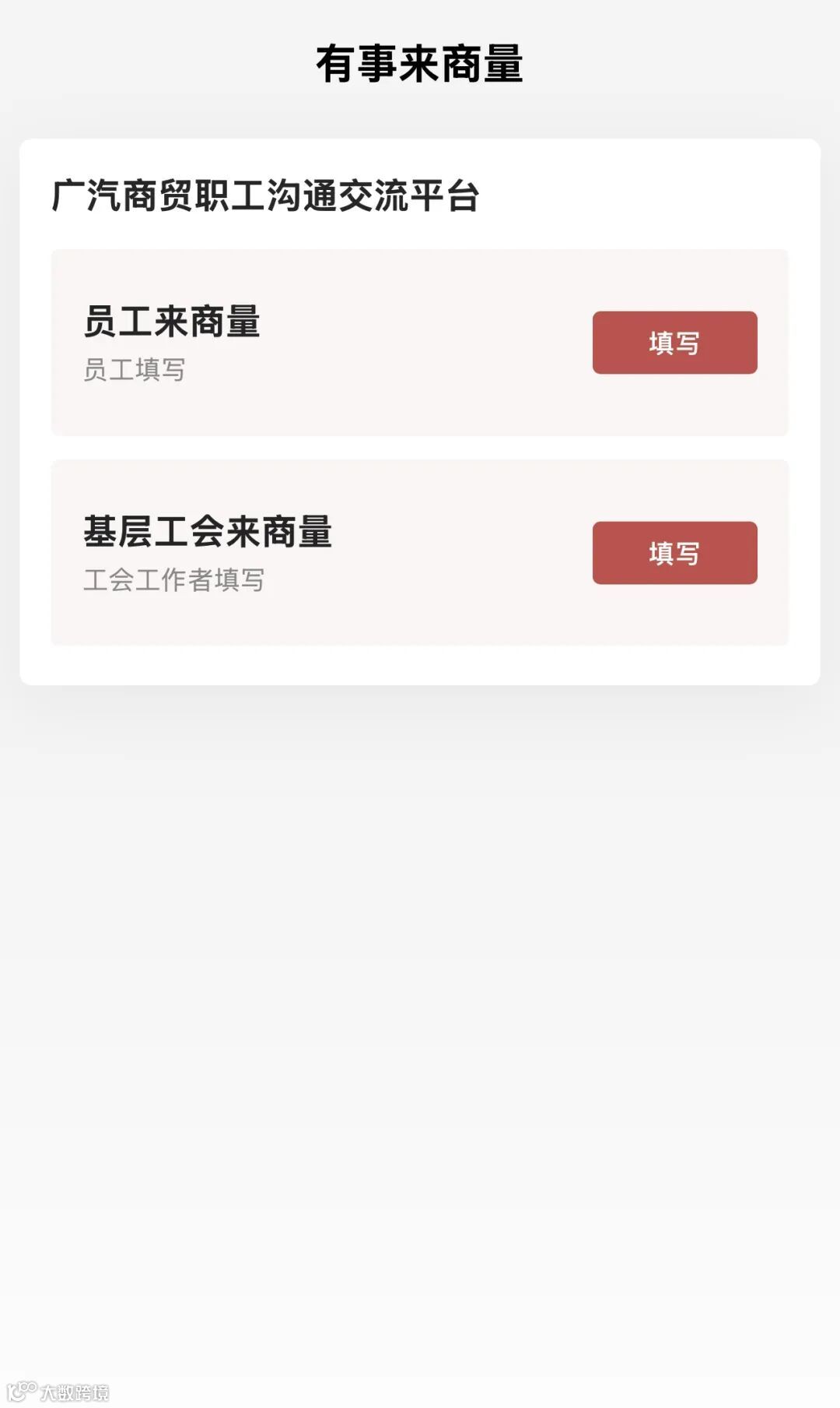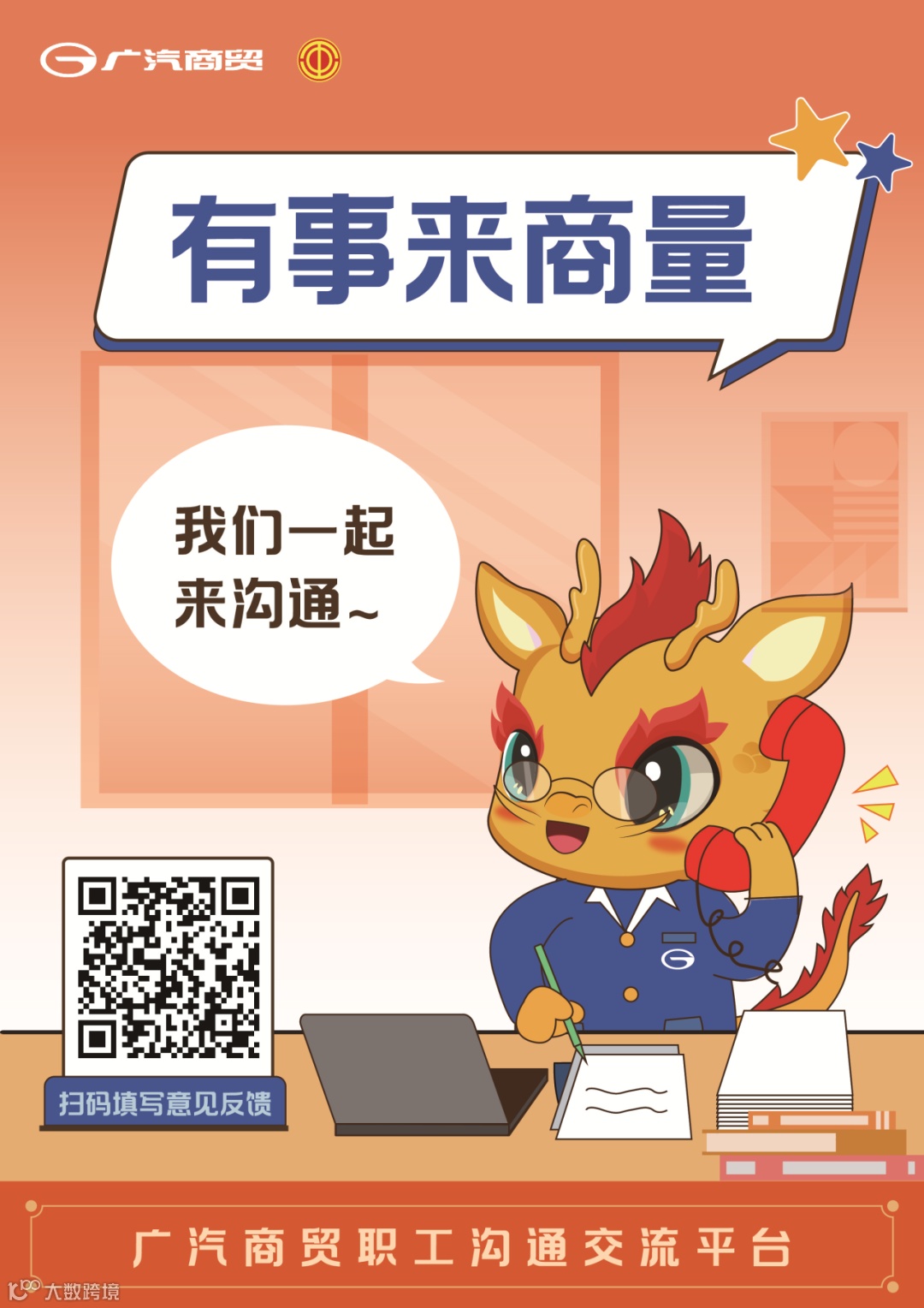 “有事来商量”平台面向广汽商贸全体职工、工会工作者,分别开通【员工来商量】和【基层工会来商量】两个渠道,不同反馈主体只需扫描海报中的二维码,根据反馈类别,点击对应按钮,按照相关提示填写对应信息,点击提交,即可完成。