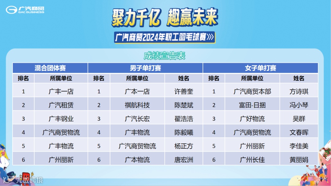 至此,聚力千亿、趣赢未来-广汽商贸2024年职工羽毛球赛圆满结束!赛场上闪耀的你们,每一滴汗水都是通往荣耀的阶梯,不仅是速度与力量的较量,更是梦想与坚持的舞台!让我们秉承敢于拼搏,永不言败的精神风貌,以更加斗志昂扬的状态投身到“万亿广汽”、“千亿商贸”的建设中,让我们携手并进,点燃心中不灭的奋斗之火,以无畏之姿,乘风破浪于奋斗的浪潮之中,用满腔的热情和不懈的努力,共同谱写广汽商贸辉煌灿烂的青春华章!