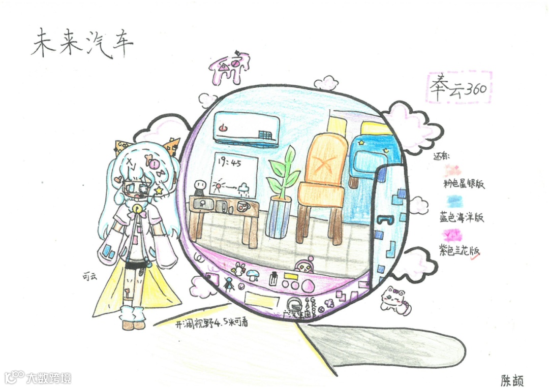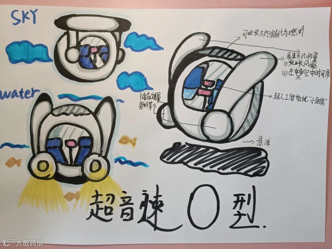 创作理念:未来超音速O型智能车,是一款可以在空中飞、陆地上行驶,也可以在水中潜的智能汽车,自带智能小厨房和卧室,可吸收太阳能和利用风能化为燃料。