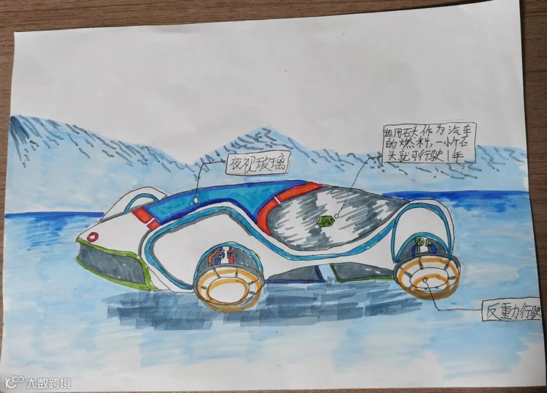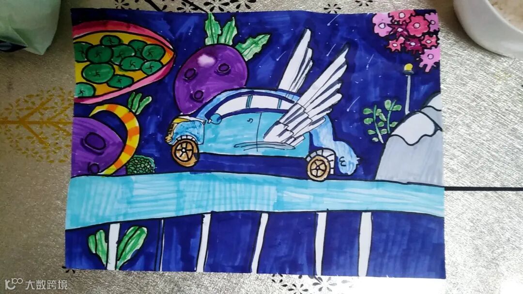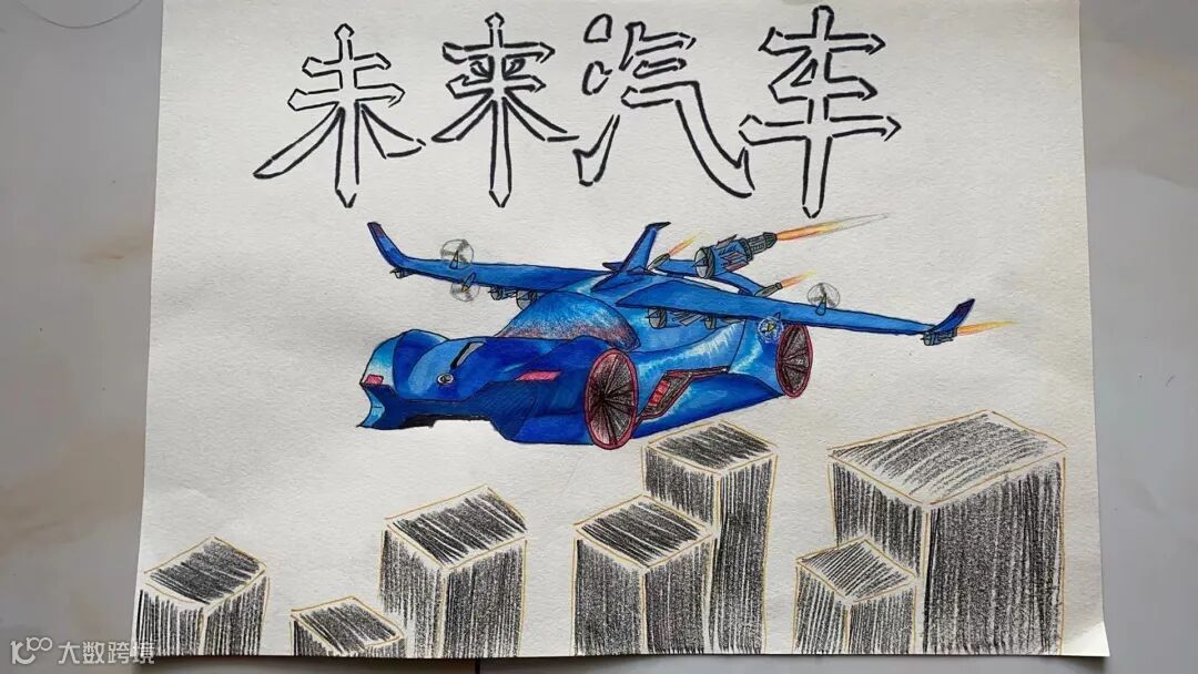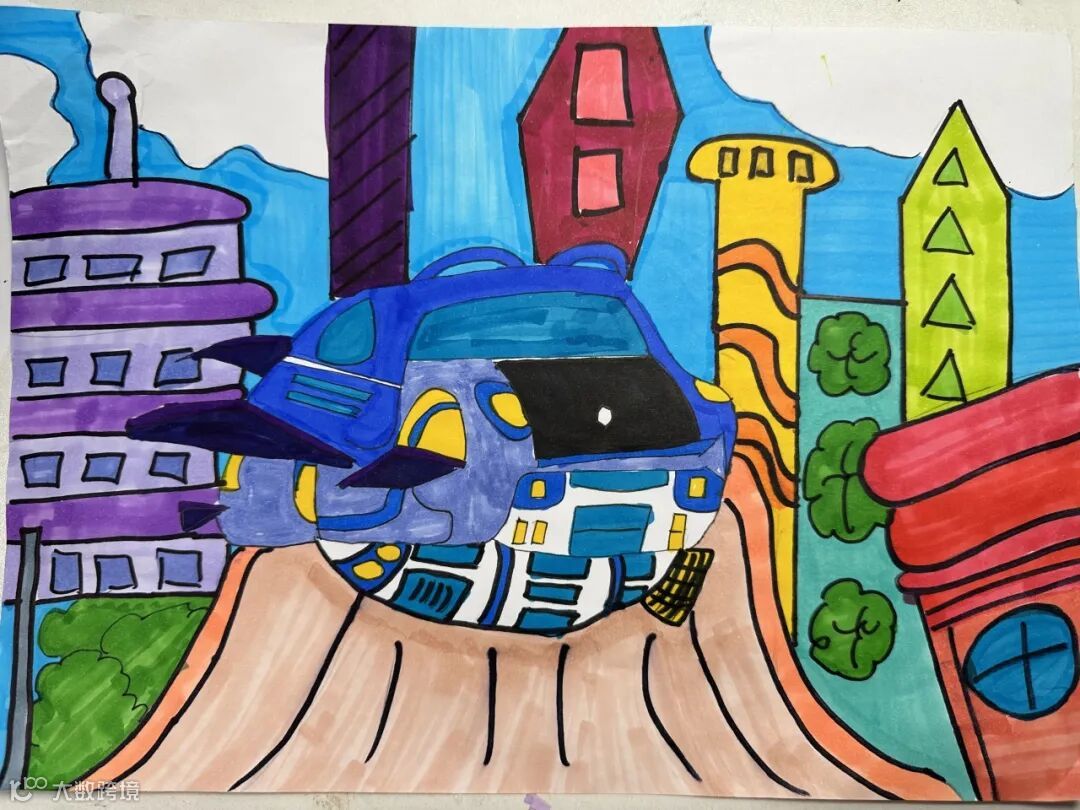 创作理念:为了减少地面道路的拥堵,我理想中的未来汽车可以实现地面和空中的双重使用功能,还会有加速器,可以快速飞抵目的地。