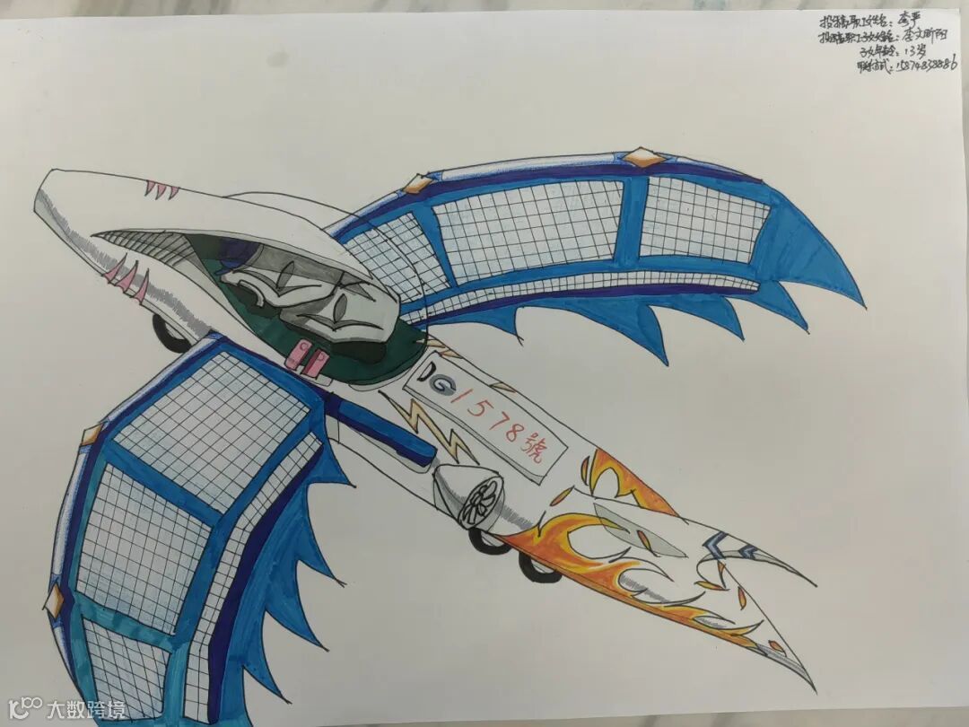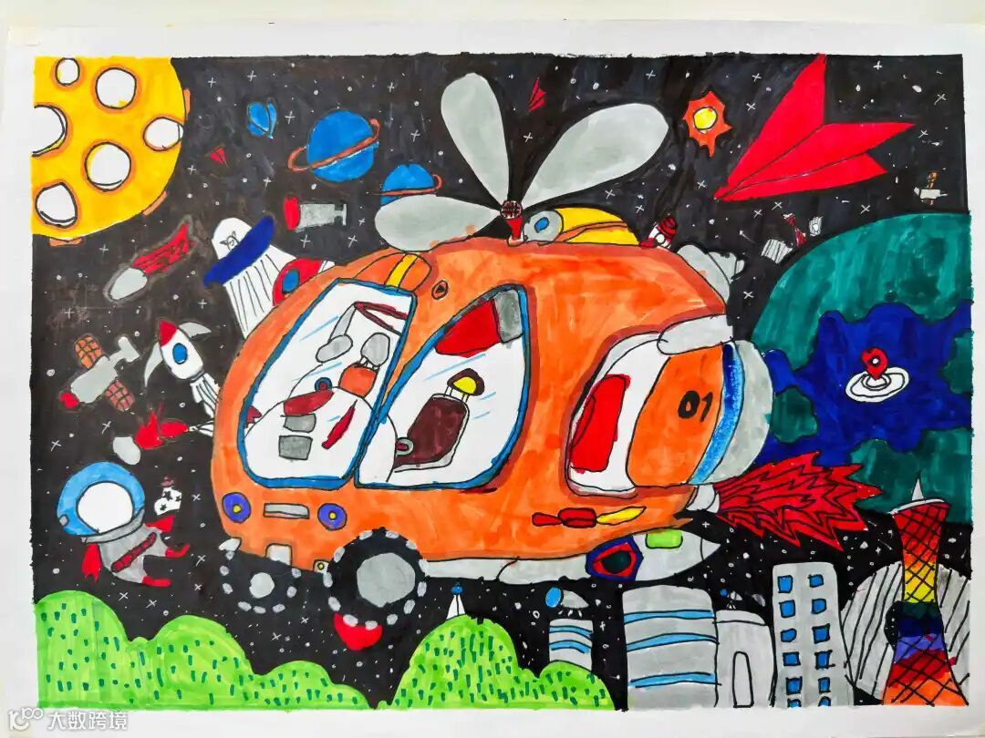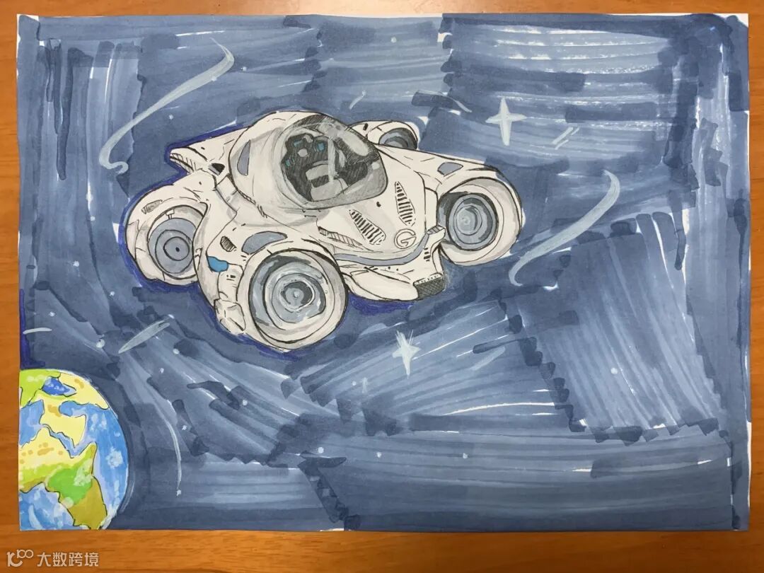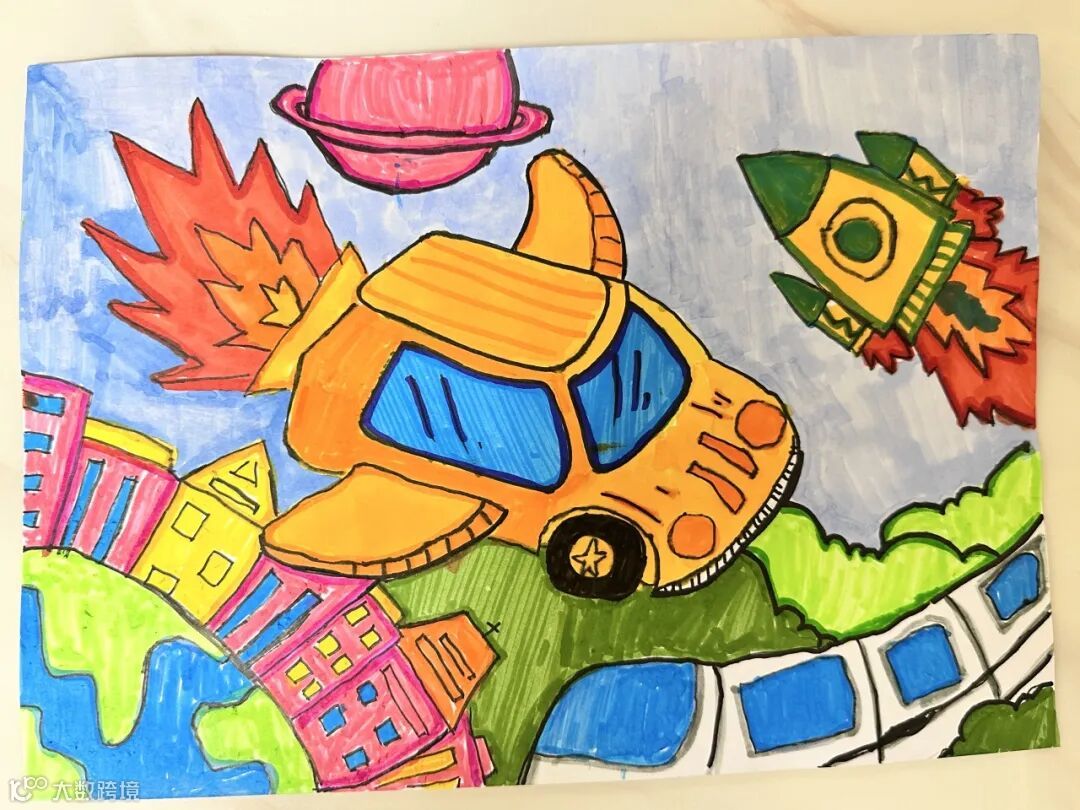 创作理念:为了减少地面道路的拥堵,我理想中的未来汽车可以实现地面和空中的双重使用功能,还会有加速器,可以快速飞抵目的地。