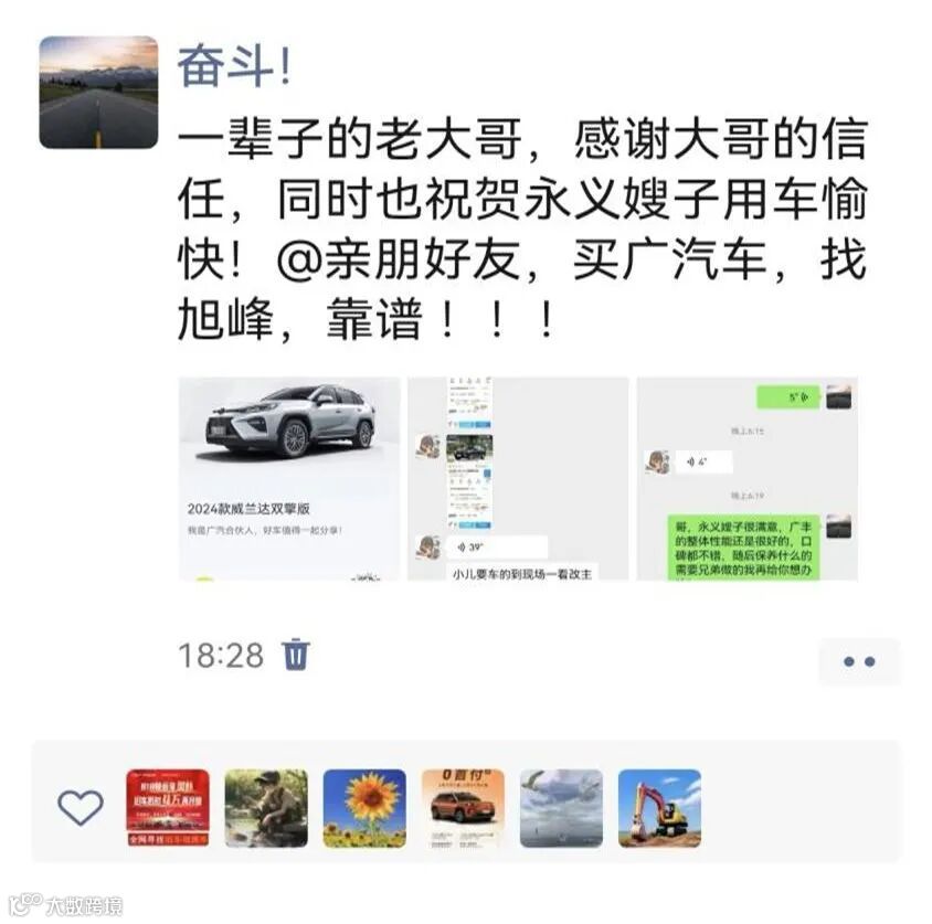 首先,我积极宣传发动身边的亲朋、好友来买广汽车。亲戚朋友都知道我在广汽工作,所以他们想买广汽的车第一时间就能想到我,也会介绍朋友的朋友、朋友的亲戚给我,朋友圈越来越大,“买广汽,找旭峰,靠谱!”这已经成为我的口头禅,基于对我的信任,他们就算不买也是挺高兴的。