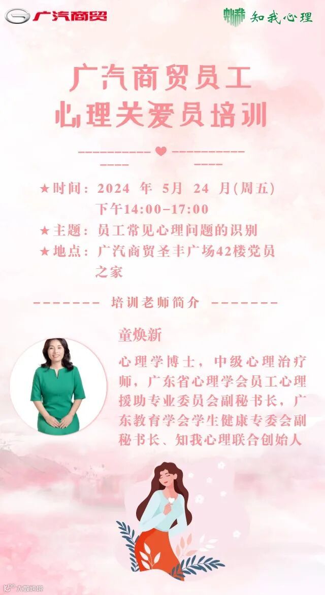 5月24日,广汽商贸第四届员工心理关爱主题日当天将同步开展“广汽商贸员工心理关爱员培训”,向职工传递爱与关怀,以更积极健康的情绪和方式工作与生活,提升职工的幸福指数。