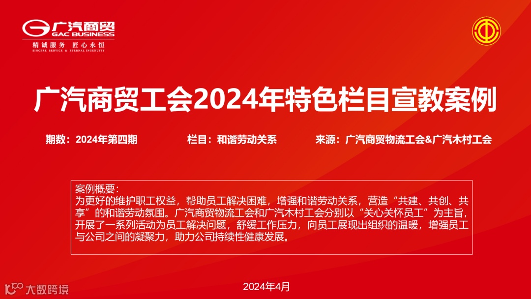 为进一步深入践行广汽集团工会“共建共创共享”理念,围绕广汽商贸工会年度工作重点,进一步促进各基层工会互相交流学习,广汽商贸工会于2024年1月创建工会工作特色宣教栏目,挖掘全国各基层工会工作优秀案例,总结提炼、资源互通、经验共享,助力各企业共同成长。