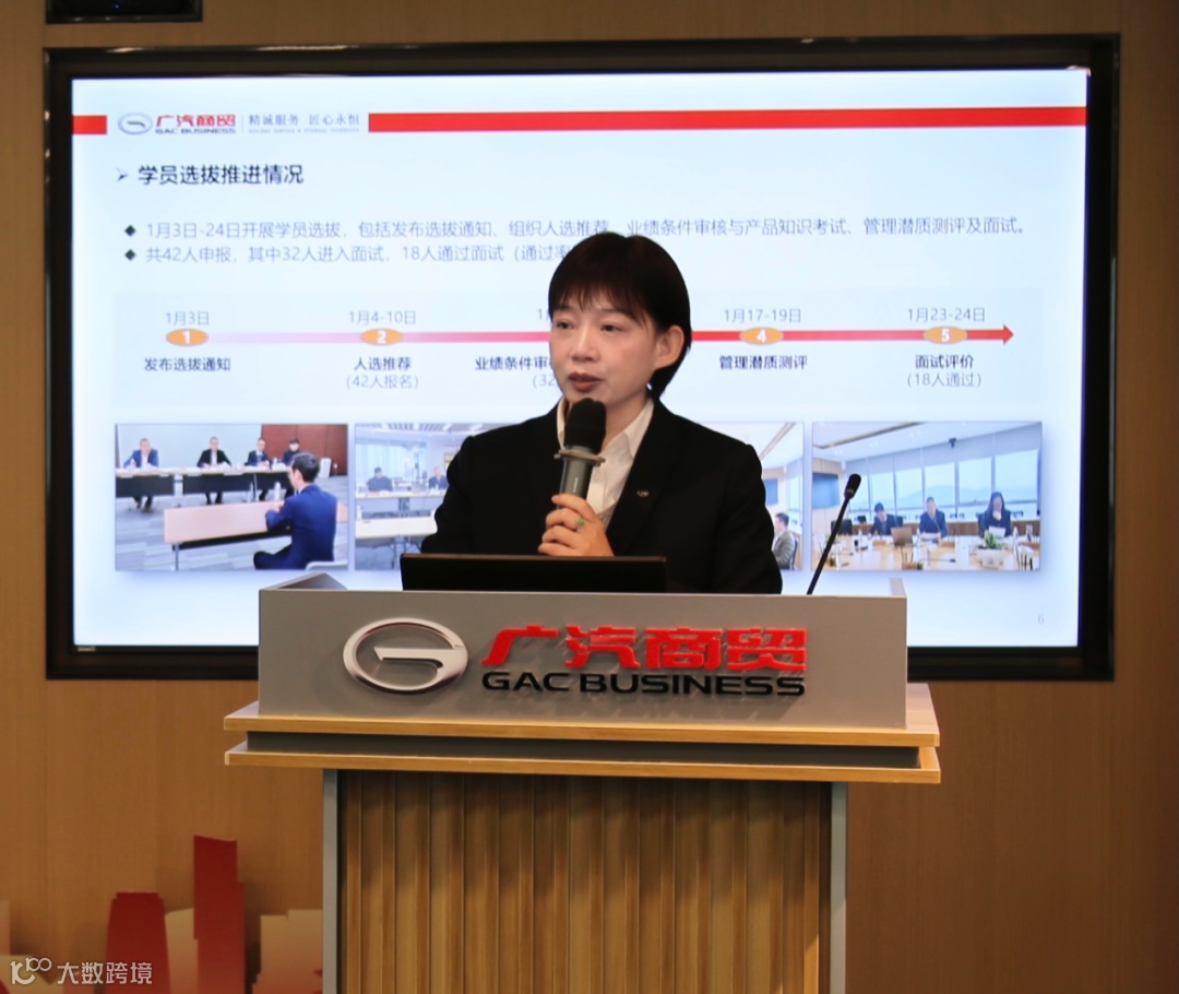 首先,广汽商贸研修中心负责人胡军梅对本期培训班的学员选拔情况、培训整体安排及培训管理等作详细介绍。