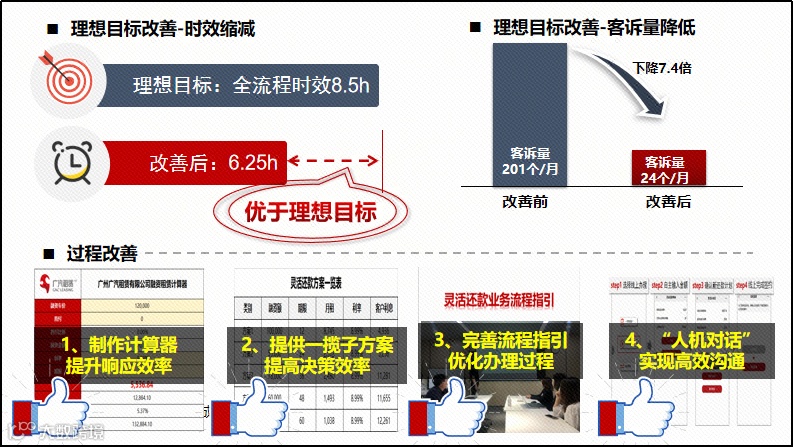 历时10个月,改善小组将实施对策集成优化,利用信息化手段推出“灵活还款业务自动化办理系统”,为客户提供一体化的最优解决方案,超额达成了课题既定目标:将客户灵活还款业务办理时效15小时降低至6.25小时,极大缓解了广汽租赁销售团队在客户维系方面的压力,显著提升了客户满意度!