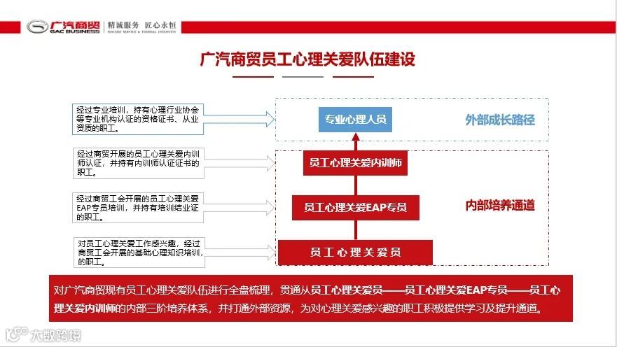 五年来,广汽商贸工会逐步打造了从员工心理关爱员到EAP专员再到员工心理关爱内训师的三阶培养体系,并打通外部培养途径,鼓励有兴趣有能力的职工积极学习专业心理学知识,为企业赋能、为职工助力。