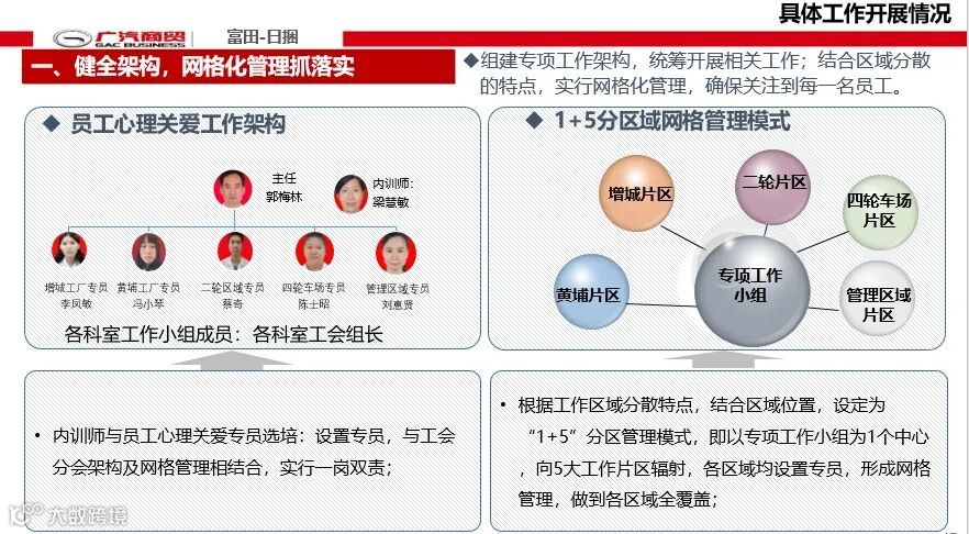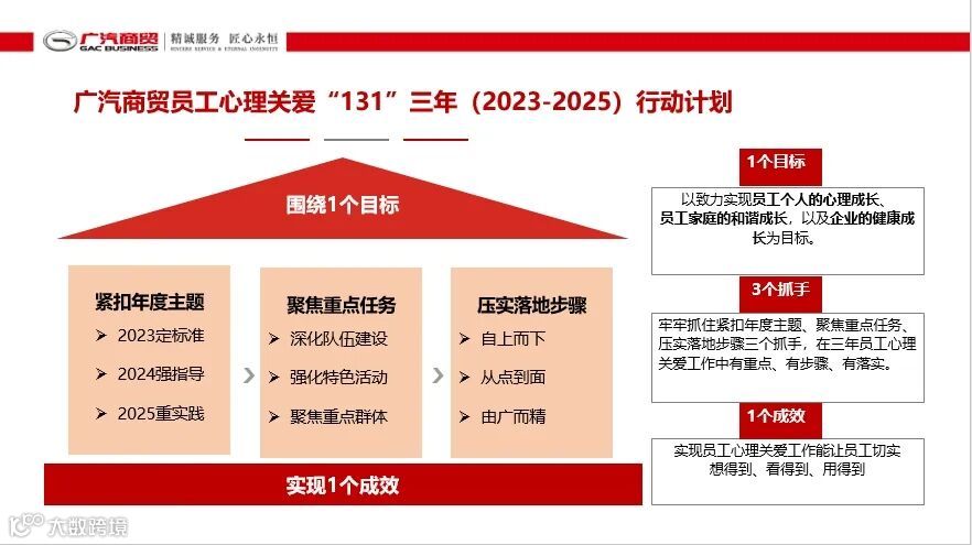 形成以三年一次“员工心理关爱总结分享会”为抓手,行政工会共参与的推进机制。2023年度,广汽商贸第二次员工心理关爱总结分享会明确今后三年员工心理关爱工作“131”三年行动计划,为今后三年商贸员工心理关爱工作明确了方针与措施。