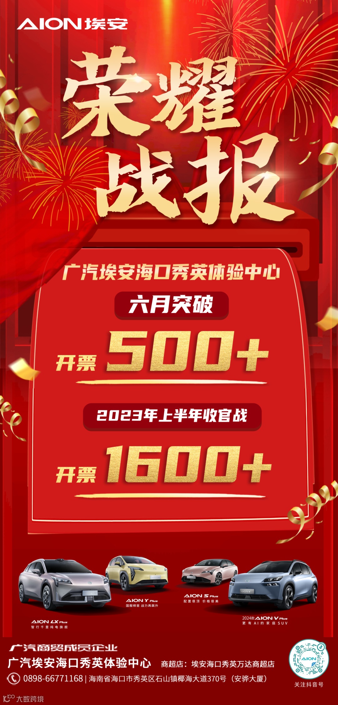正式开业之后,面对新能源车良好的发展态势,海口秀英埃安店深入市场营销一线抢抓机遇,组织对店端周围10公里范围的扫桩、扫楼、摆展等,扩大店端知名度;实行网约车司机到店引流活动,抢占网约车市场份额。多措并举做好市场信息收集、开拓客源到店。截止到2023年6月30日,外展累计45场 ,店端活动30场,车展9场,零售累计客流2500批,累计订单1393台。